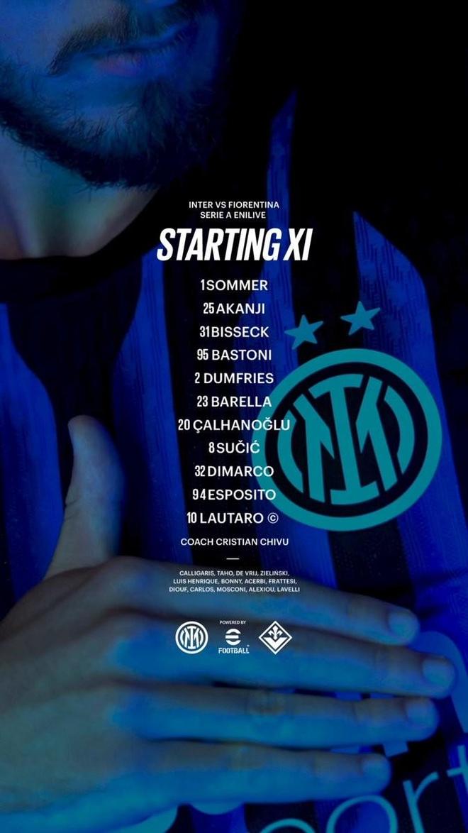 国米首发:1-索默、25-阿坎吉、31-比塞克、95-巴斯托尼、2-邓弗里斯、23-巴雷拉、20-恰尔汗奥卢、8-苏契奇、32-迪马尔科、94-皮奥-埃斯波西托、10-劳塔罗